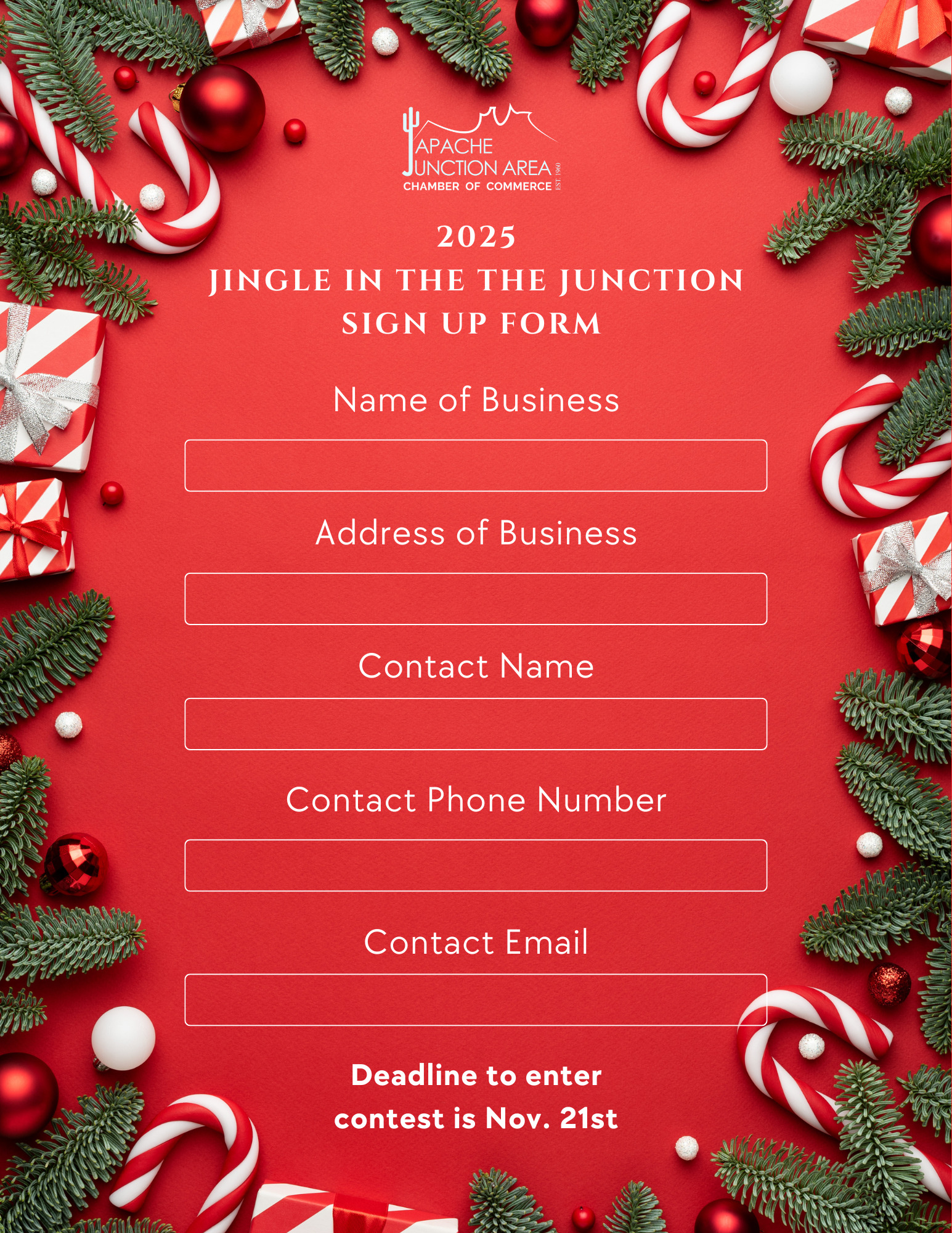 Open to Apache Junction, Gold Canyon, and East Mesa businesses, Jingle in the Junction showcases businesses that Light Up the Apache Junction area with the most Holiday Spirit!